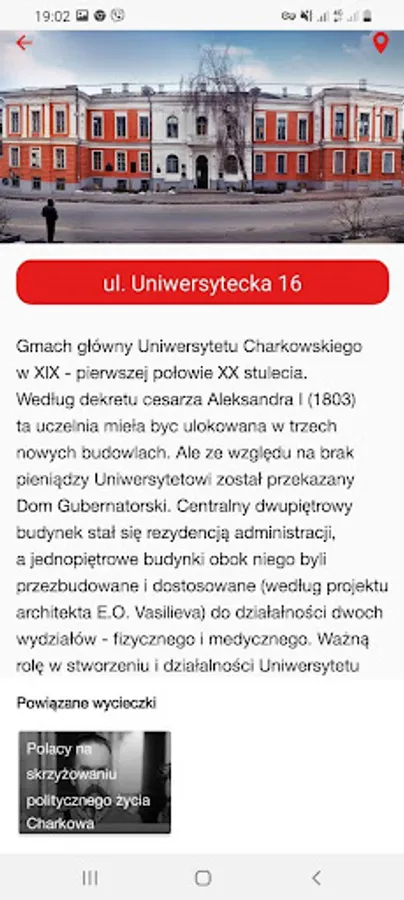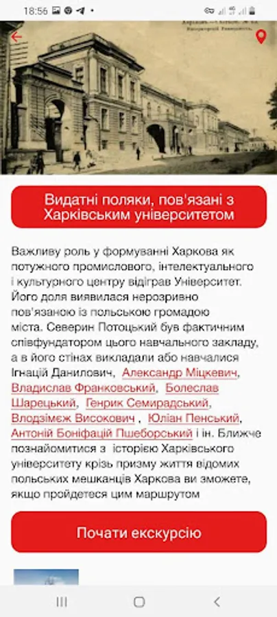 The availability of three language versions of the content (namely Ukrainian, Polish and English) lets a wide range of people both in Ukraine and abroad access this knowledge. "Polish Heritance in Kharkiv" addressed to everyone interested in the history of Polish community of Slobozhanshchyna and wished to know anymore about its prominent representatives, their contribution to the world culture and history. Mobile application can be also used as a digital helper for tourists who want to make themselves walking tours through the streets of Kharkiv.