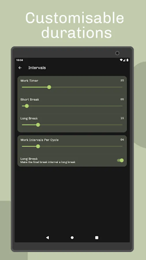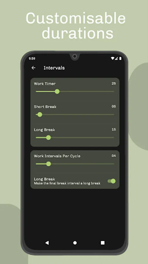 The popular Pomodoro Technique and 52/17 Rule are supported through customisable work and rest interval durations, with additional options available to customise your experience to match your preferences.