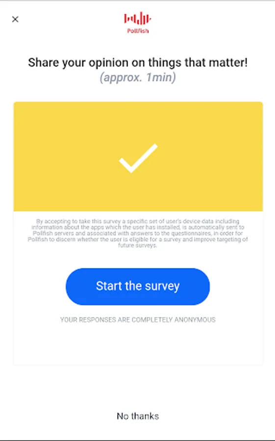 Pollfish is a mobile monetization platform delivering surveys instead of ads through mobile apps. It was established in 2013 and it has offices in New York, US and Athens, Greece. Pollfish provides a DIY survey tool on its website where anyone can visit create a survey, select which people to target and start receiving results in real time. These surveys are distributed through Pollfish's app publisher network who integrate Pollfish surveys in their apps in order to make money.