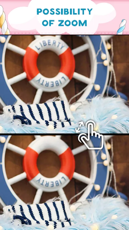 Zoom functionality will help you to spot even well hidden differences. No time limit - search at your own pace. Your goal is simple: look at the pictures, find the differences, then tap each one you locate.