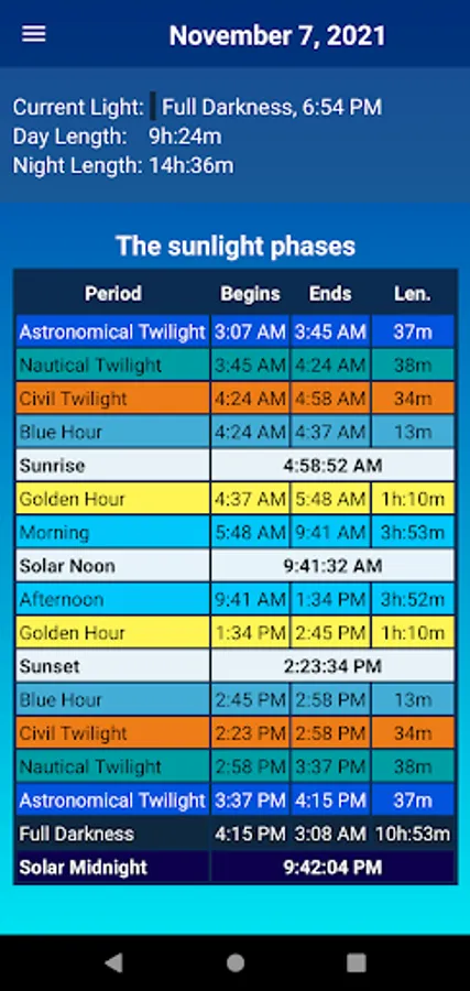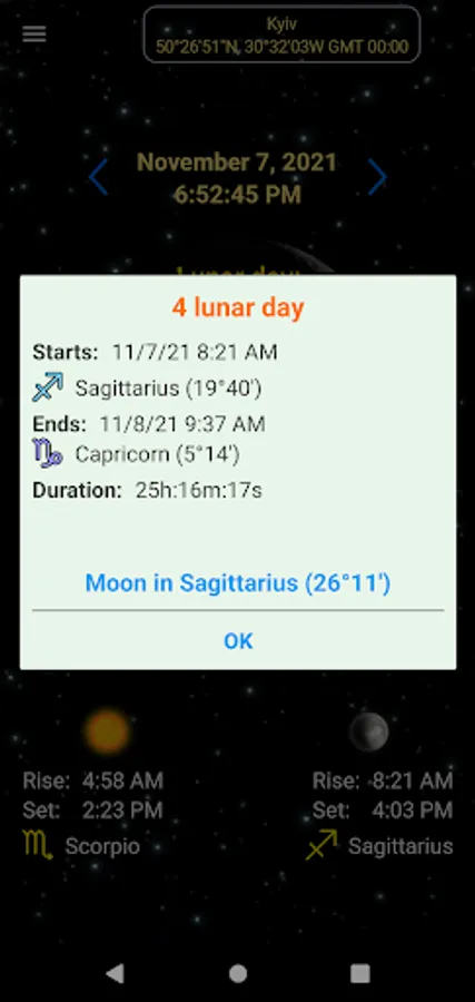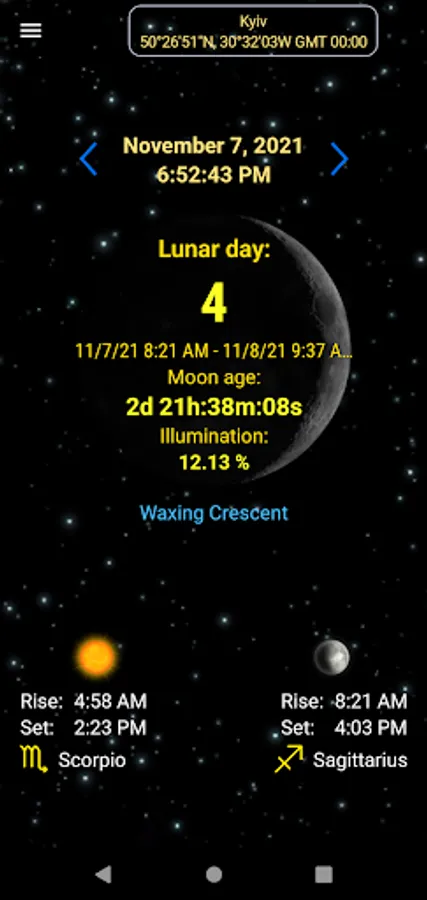 - The moon's age, the time of sunrise - sunset, moonrise - moonset;