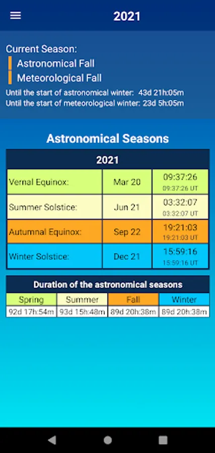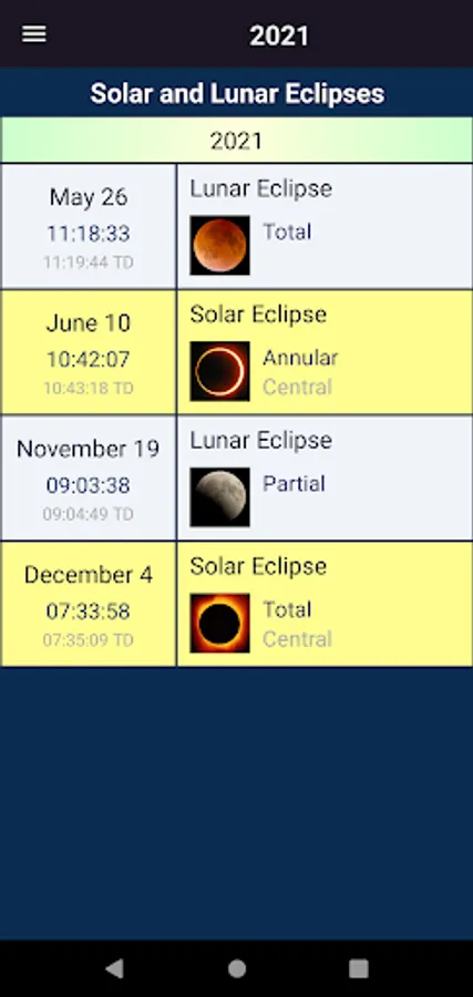 - Solar and lunar eclipses for current year (a type of eclipse, date and time of eclipses);