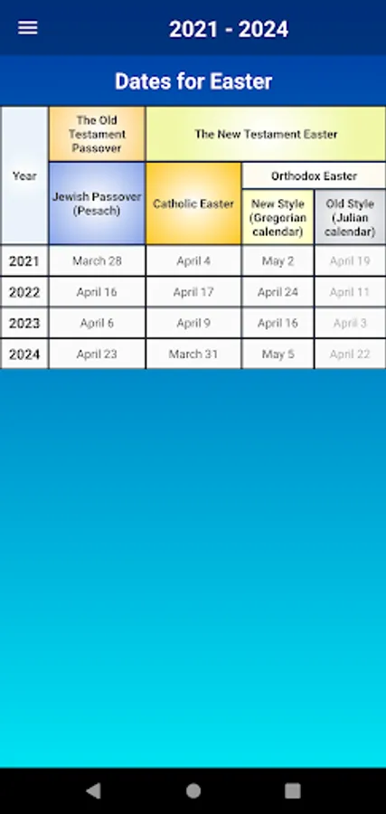 - The dates for the celebration of Easter: Orthodox (old and new style), Catholic, Jewish Passover (Pesach)