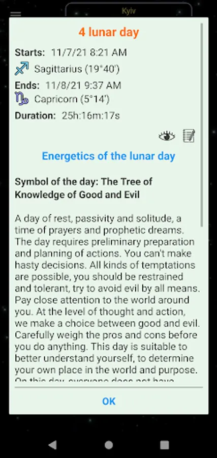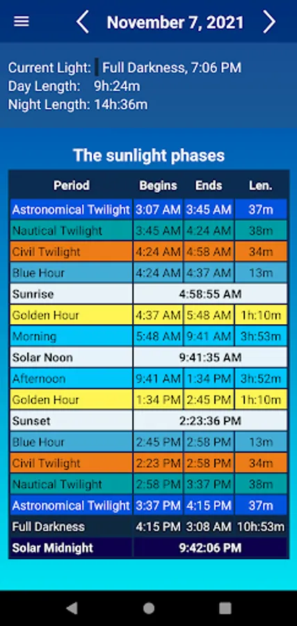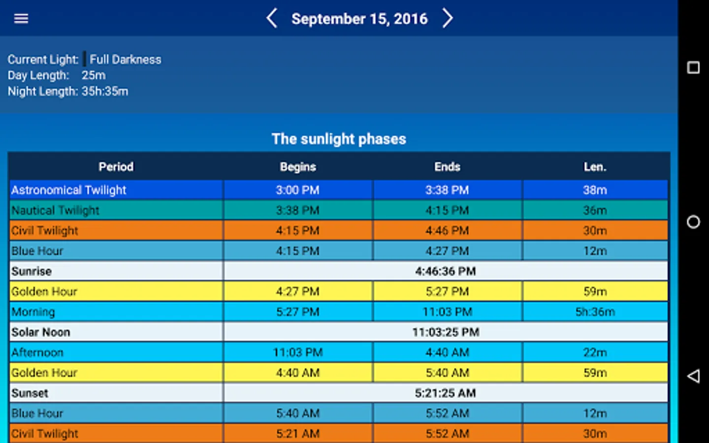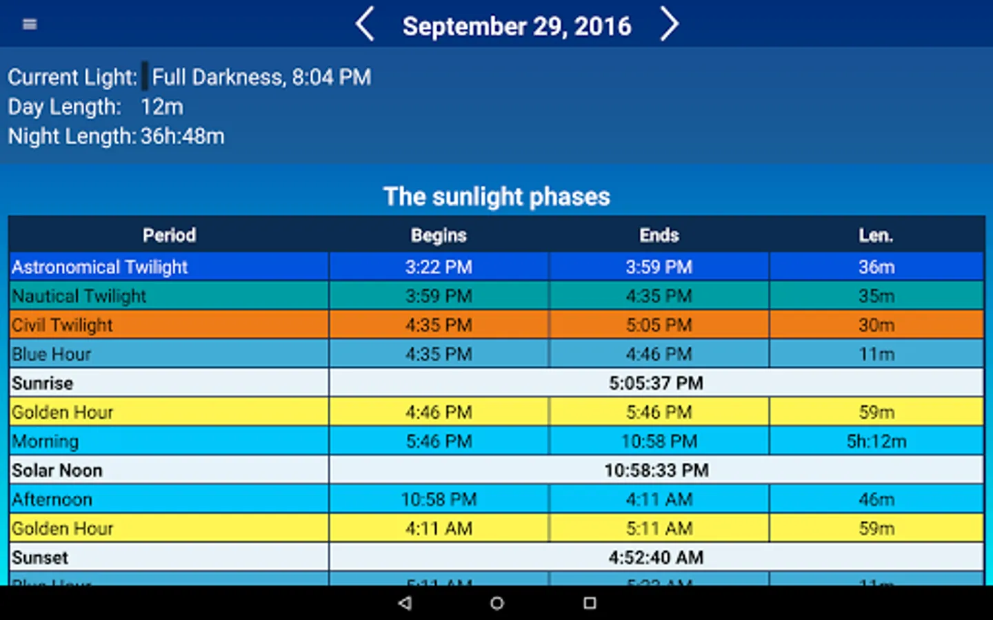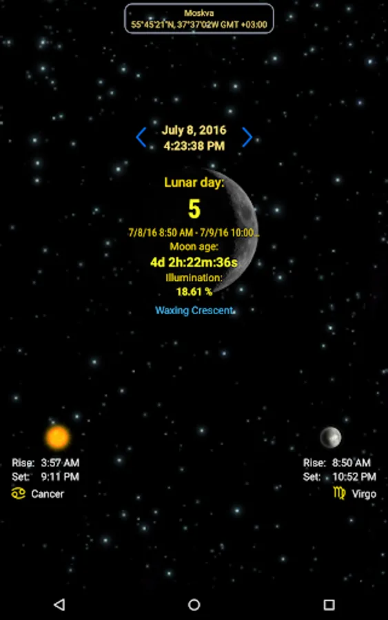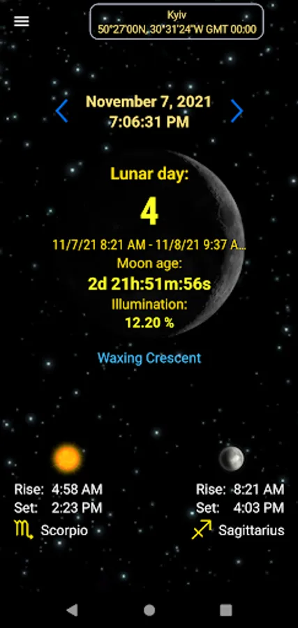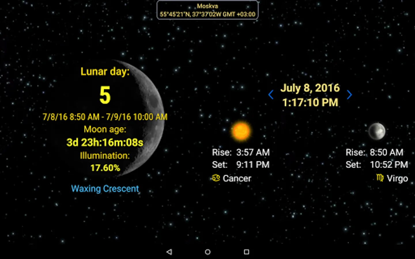 - The moon's age, the time of sunrise - sunset, moonrise - moonset;