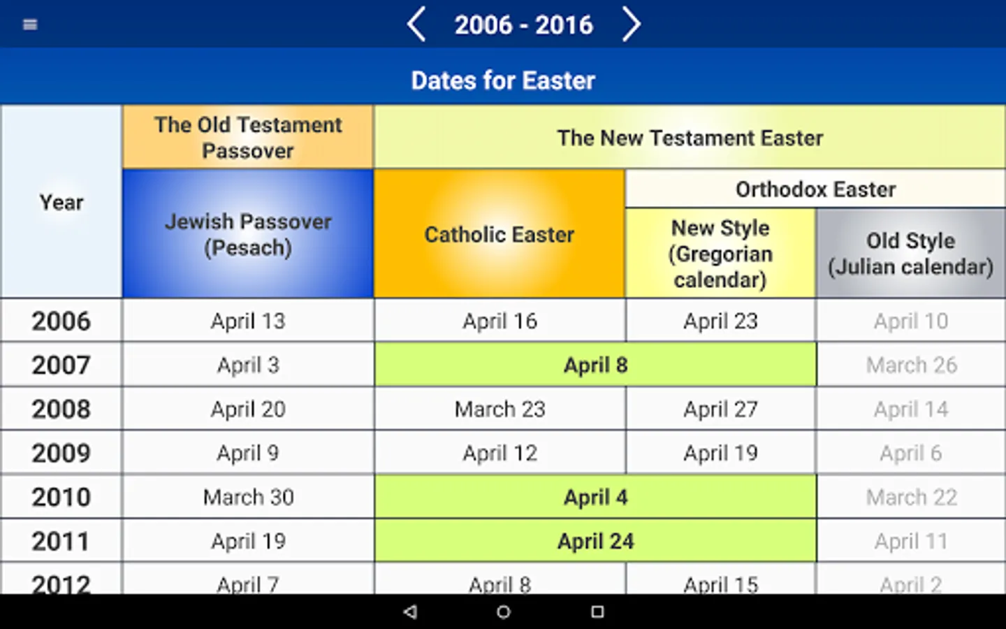- The dates for the celebration of Easter: Orthodox (old and new style), Catholic, Jewish Passover (Pesach)