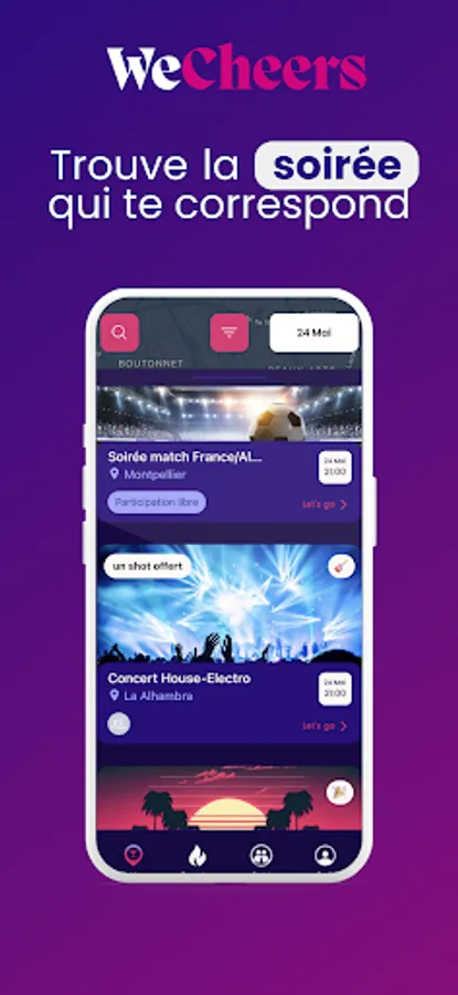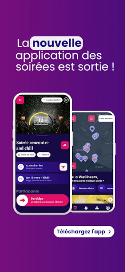 WeCheers visualizes for you the parties and events on a map in real time and offers you a drink every night in the bars and clubs of your city.