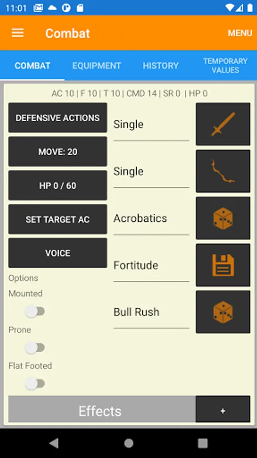 Attacks: Standard, Dual Wield, Full Round, Cleave, Doublestrike, Charge, Flurry, Backstab, Ranged