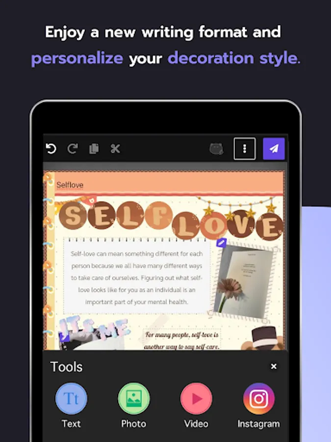 Explore our vast virtual store, filled with a plethora of stickers, sticky note, frames and decorative elements. Customize your journal to your heart's content, and make it as unique as you are.
