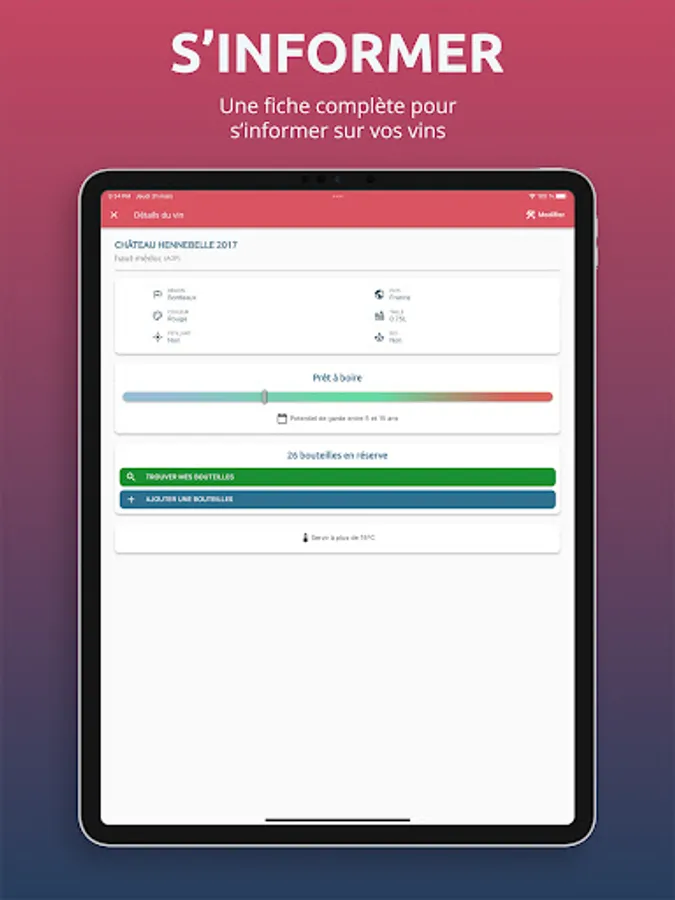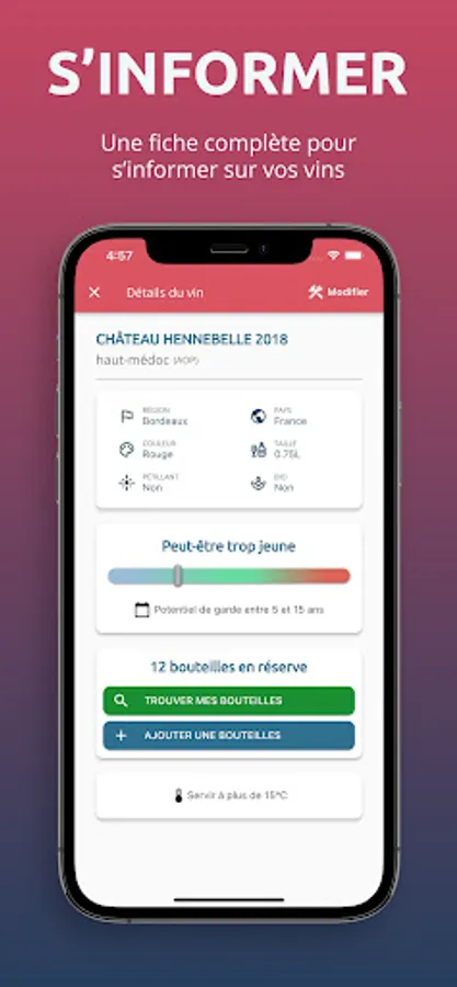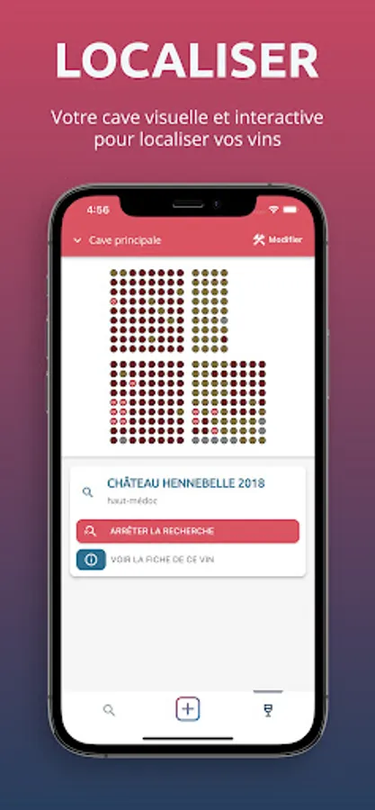 With MyWine, managing your wine cellar has never been so easy and convenient. Start by adding your bottles by simply scanning their label: information on shelf life and drinking temperature is automatically added! Then place them in your personalized cellar, which you can easily draw via our intuitive visual editor.