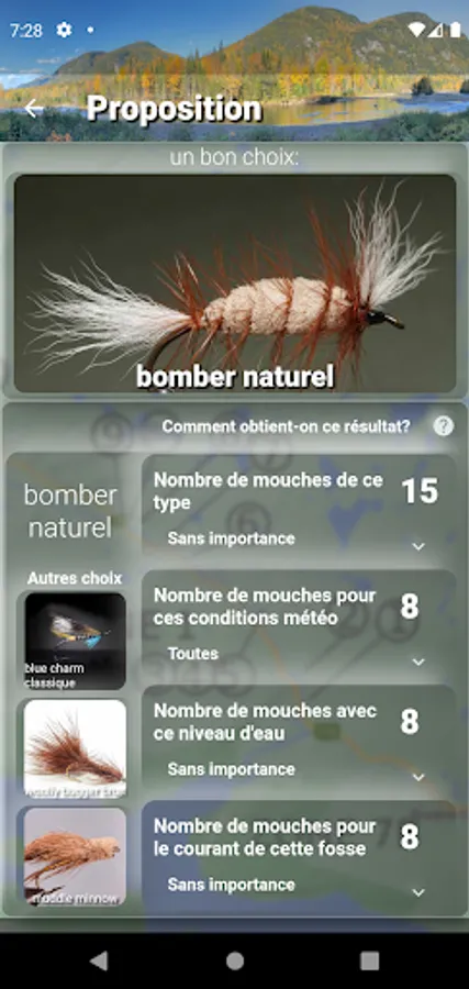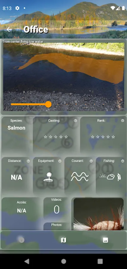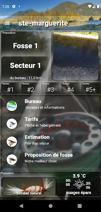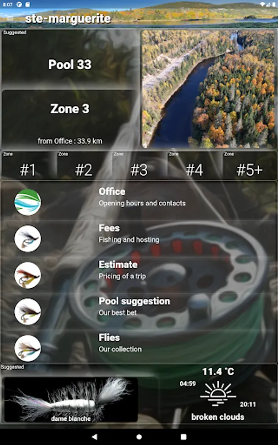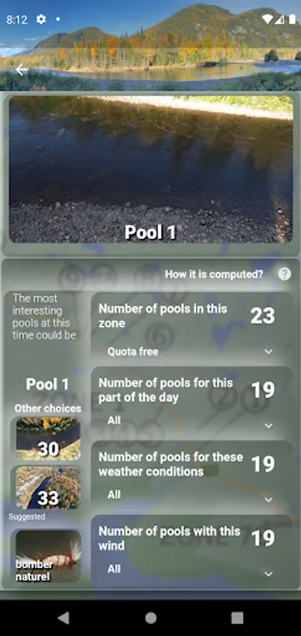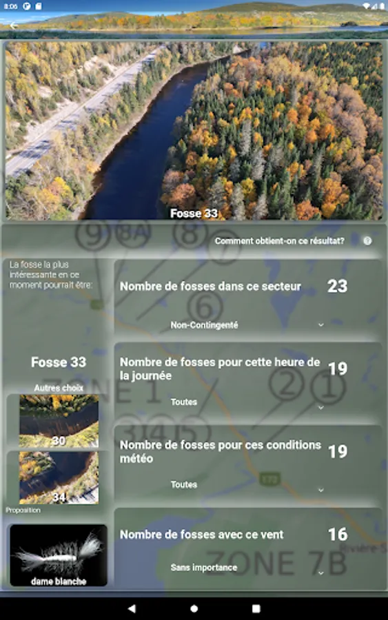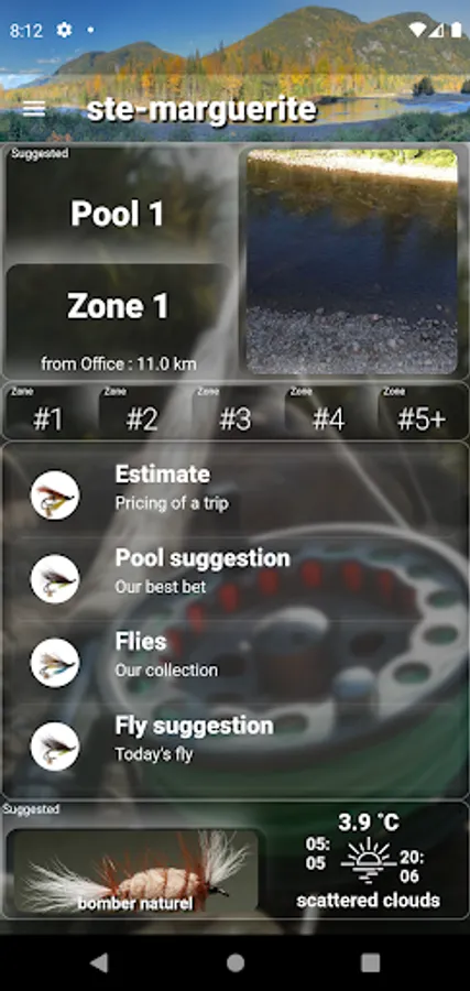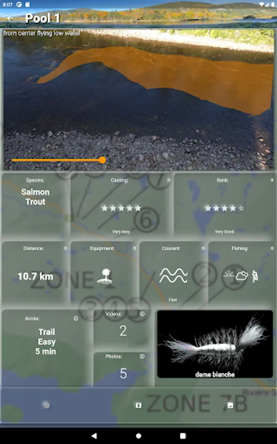 This app gives all the necessary details, aerial photos of the Pools but also where to start the rotation with a 360 photo. It suggests a Pool and a fly depending on the weather, the time of day, no artificial intelligence, just proposals based on experience. From the start, the system detects the weather and suggests a pool in the area you are going to fish and even a fly that might be suitable depending on the current of the pool and the light. You can decide if you prefer a dry or wet fly or what criteria doesn't matter.