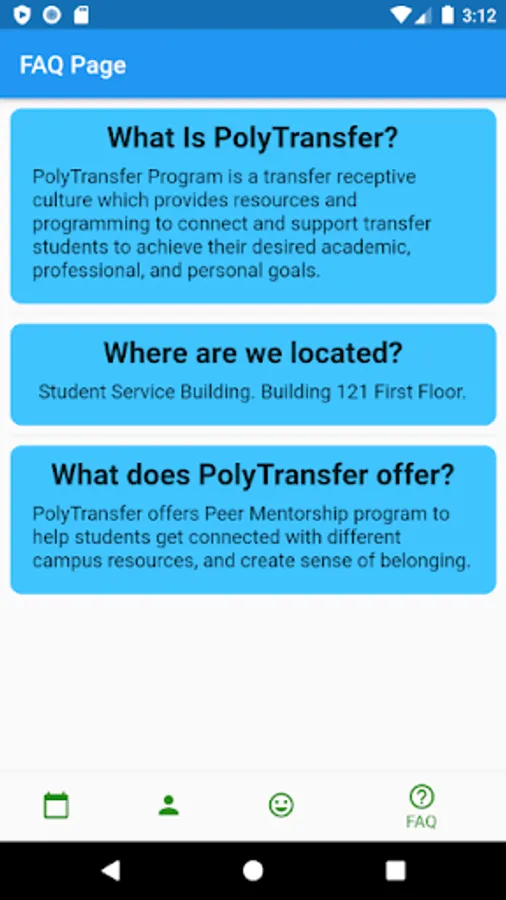 This application is for Cal Poly Pomona PolyTransfer Students. This will help students to navigate the PolyTransfer program easily and be in contact with their mentors and on-campus resources as well as events happening on campus.