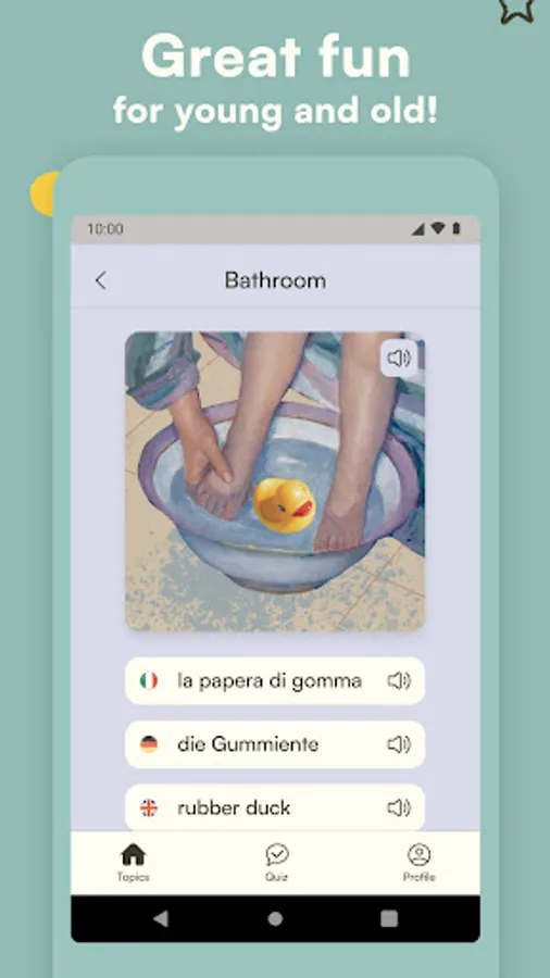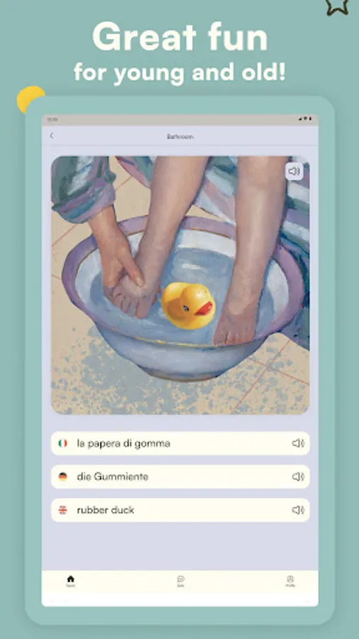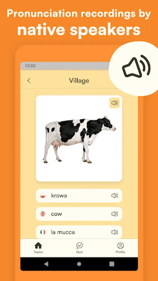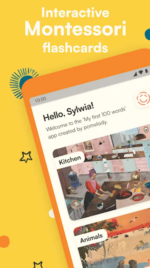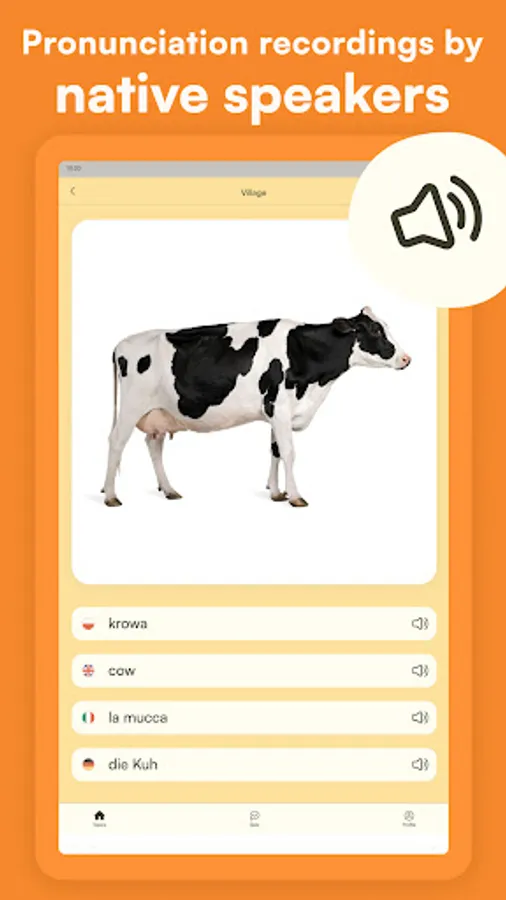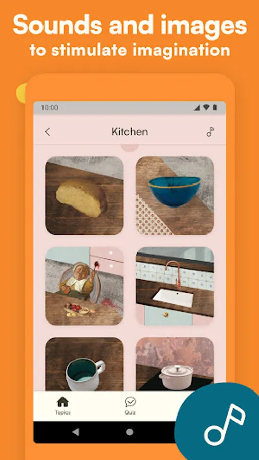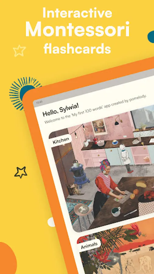 Each word is accompanied by: a beautiful illustration, a real photo, sound and a pronunciation recording by a native speaker. Words are grouped into 10 categories, presented in artistic collages, to which we have added soundscapes.