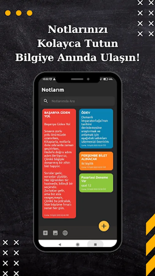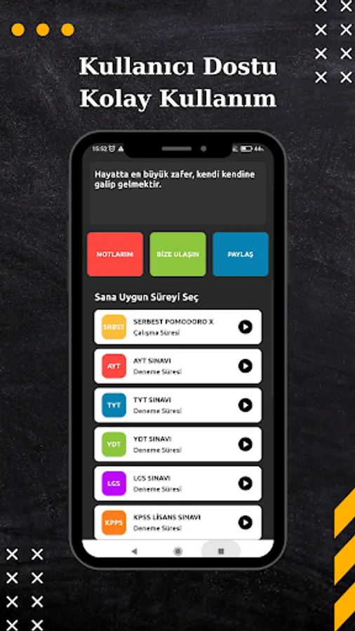 In our application, there are motivational words that will motivate you, thus allowing you to provide the best performance while studying and doing a job. In our Pomodoro application, we have created an area suitable for you in the form of AYT EXAM, TYT EXAM, YDT EXAM, LGS EXAM, KPSS UNDERGRADUATE EXAM, KPSS ASSOCIATE LICENSE EXAM. We aim to choose the exam system that suits you and use your time effectively in the exam. If you always study within the time available to you, you will be one step ahead of your competitors in the exam. Additionally, with the pomodoro technique, we offer you a pomodoro 25-minute study environment, a pomodoro 30-minute study environment, a pomodoro 45-minute study environment and a pomodoro 60-minute lesson. We have prepared a study environment here, after choosing the appropriate time for you and pressing start, all you have to do is to focus on your time. Another good thing is that you can find the ayt lecture notes, tyt lecture notes, ydt lecture notes, lgs lecture notes, kpss undergraduate lecture notes, kpss associate degree course notes that you want in the "my notes" section. You can take your notes on the subject and read the notes of your courses such as Turkish, mathematics, geometry, physics, chemistry, biology, English, religious culture and ethics, History of Revolution and Kemalism, history, philosophy, geography wherever you want. And finally, AYT 2024, TYT 2024, You will be able to see how many days are left until the YDT 2024, LGS 2024, KPSS UNDERGRADUATE 2024, KPSS ASSOCIATE 2024 exams with the pomodoro counter.