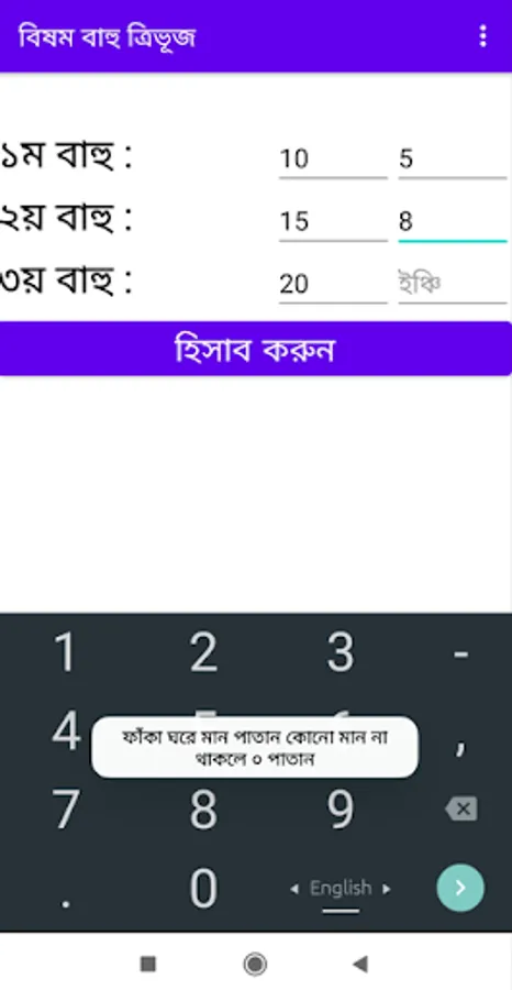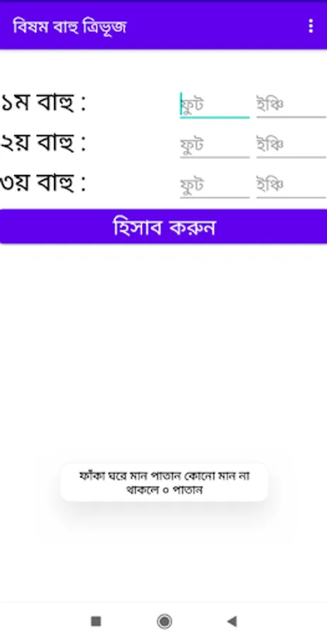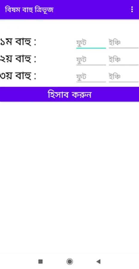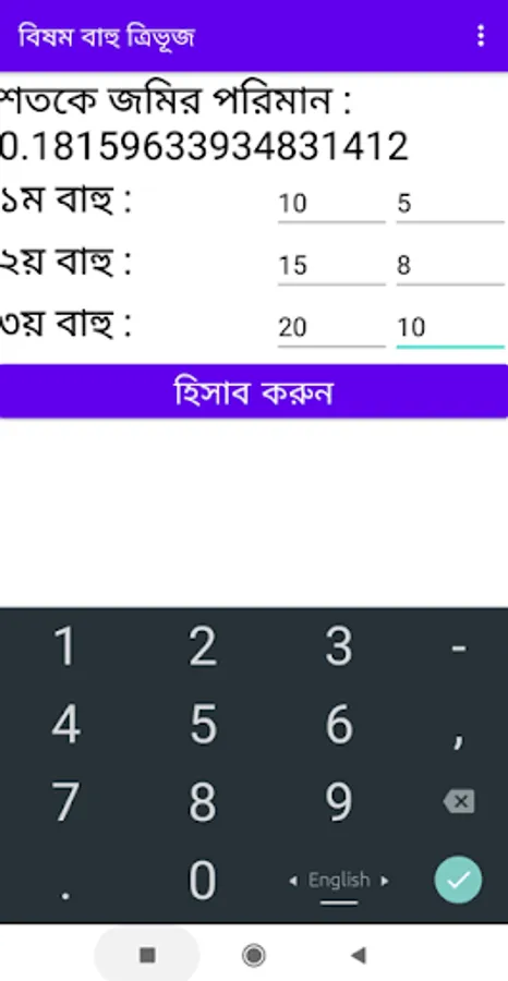 এটা একটা বিষম বাহু ত্রিভূজাক্রিতির জমির ক্ষেত্রফল পরিমাপের জন্য তৈরি করা হয়েছে। এই অ্যাঁপটির সাহায্যে একটি চতুর্ভুজাকৃতির জমির পরিমান ও নির্ণয় করা যায়, সেক্ষেত্রে চতুর্ভুজটির একটি কর্ণের দৈর্ঘ্য পরিমাপ করতে হবে। তার পর পৃথক পৃথক ভাবে দুই বার বিষম বাহু ত্রিভূজাক্রিতির জমির ক্ষেত্রফল পরিমাপ করে যোগ করতে হবে। তাহলে একটি চতুর্ভুজাকৃতির জমির পরিমান নির্ণয় করা যাবে।
