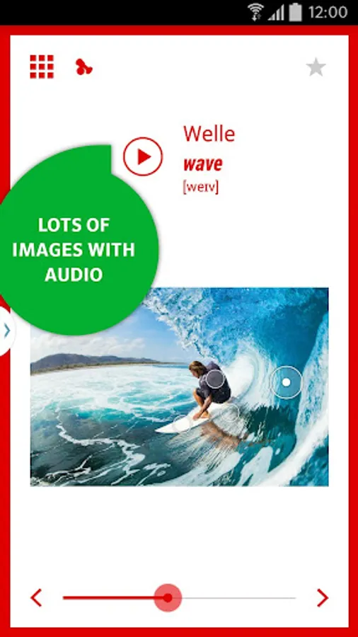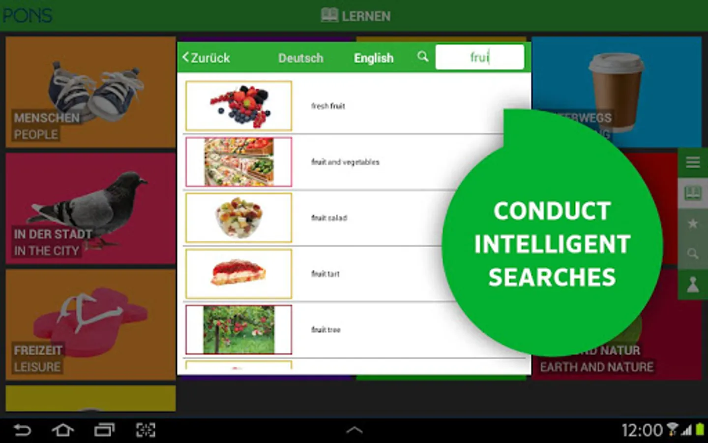 Ideal for browsing and discovering. In the picture overview you can find the correct English translation “without words”. In the search function you can look up specific words – if you want to remember a word, simply add it to your personal favourites list.