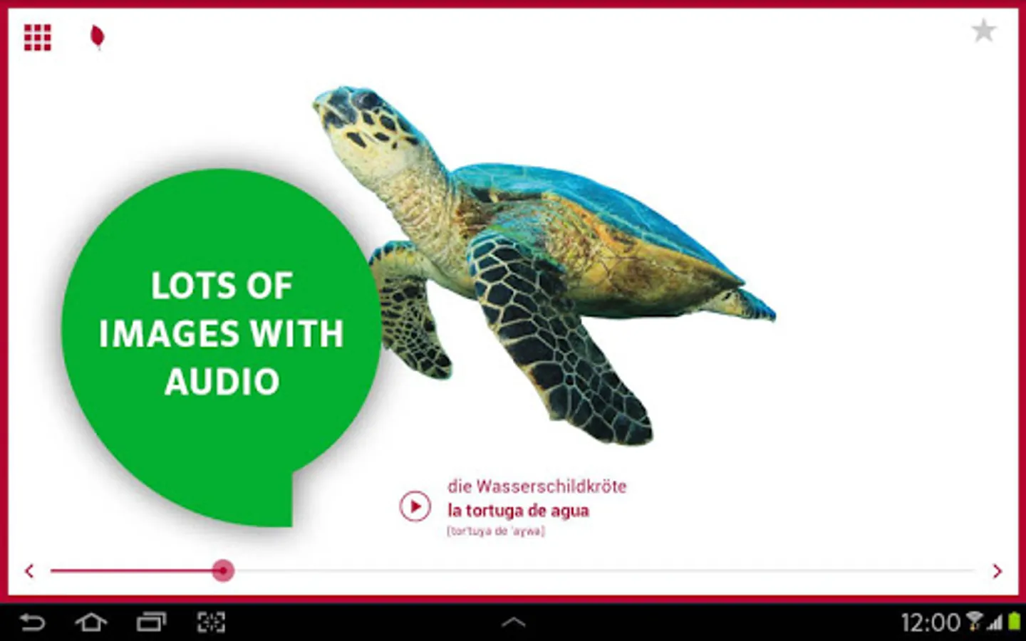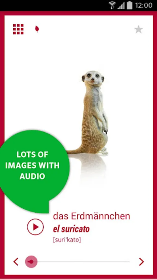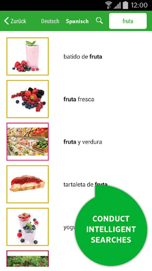 Ideal for browsing and discovering. In the picture overview you can find the correct Spanish translation “without words”. In the search function you can look up specific words – if you want to remember a word, simply add it to your personal favourites list.
