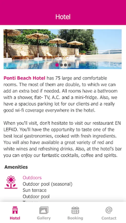 Ponti Beach Hotel has 75 large and comfortable rooms. The most of them are double, to which we can add an extra bed if needed. All rooms have a bathroom with a shower, flat- TV, A.C. and a mini-fridge. Also, we have a spacious parking lot for our clients and a really good wi-fi coverage everywhere in the hotel.