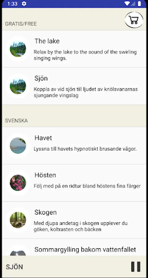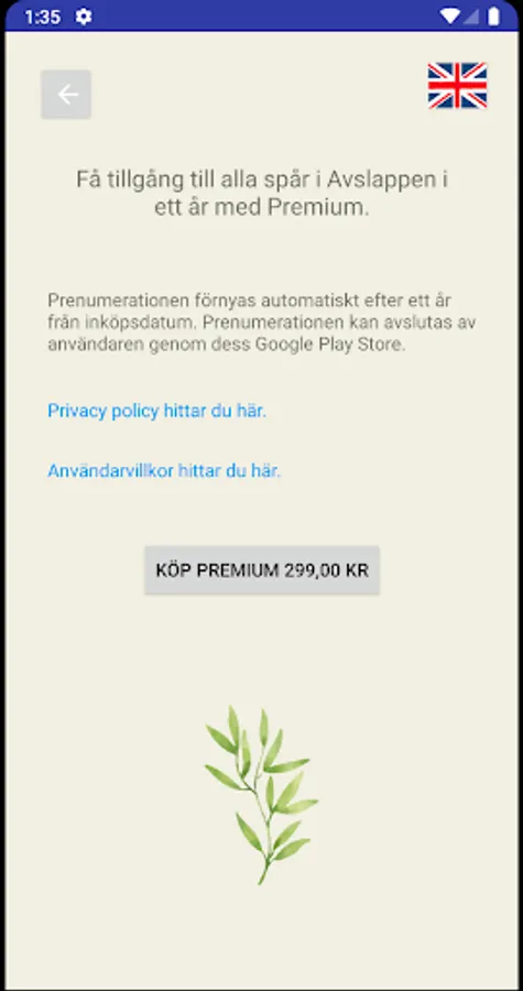 Avslappen är appen som du kan ladda ned fritt för att lyssna på avslappningsövningar. Prova spåret "Sjön" gratis, både på svenska och på engelska. Vill du få tillgång till hela 10 unika spår på svenska och engelska kan du köpa till ett år av premium för ett förmånligt pris. Mer info finns i appen.