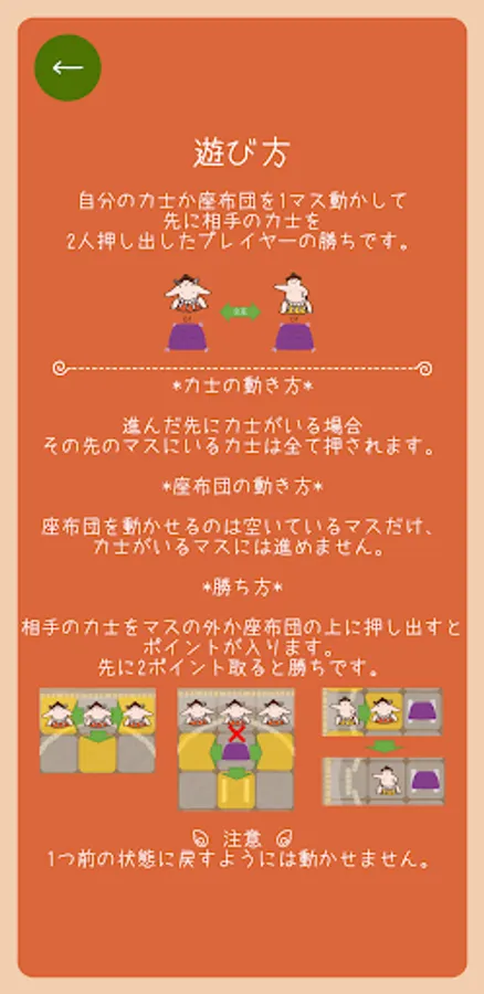 The player who moves his wrestler or cushion by one square and pushes out two opponent's wrestlers first wins.