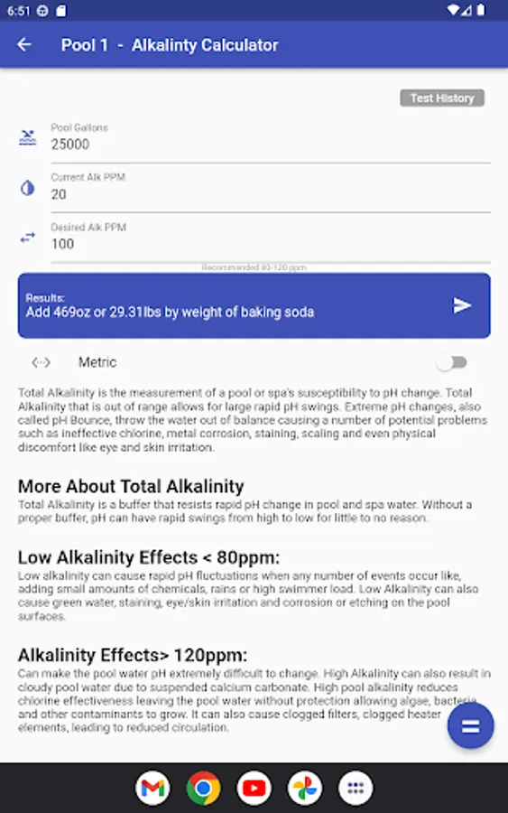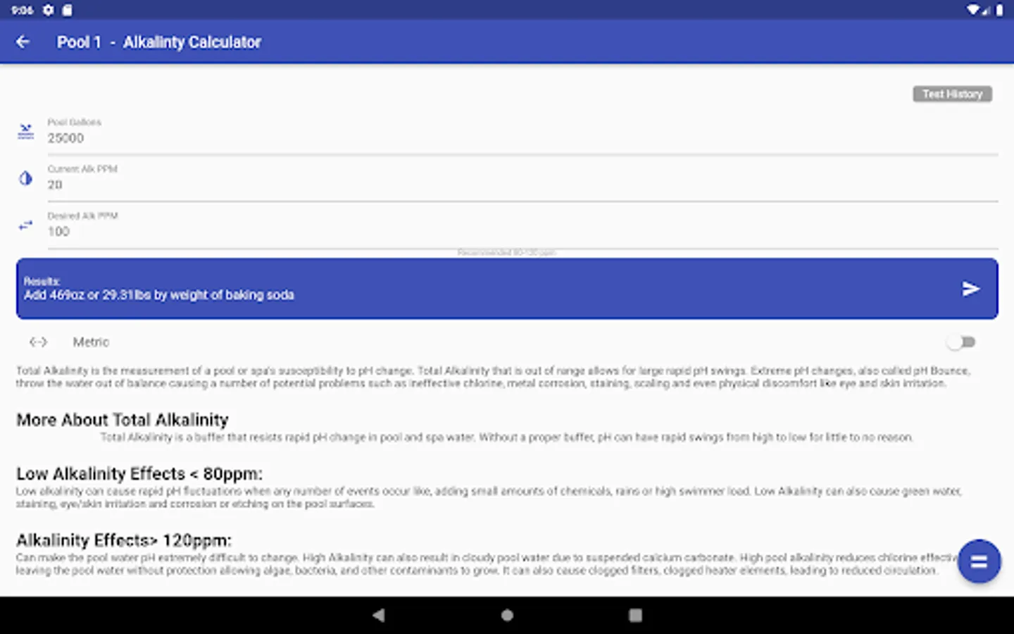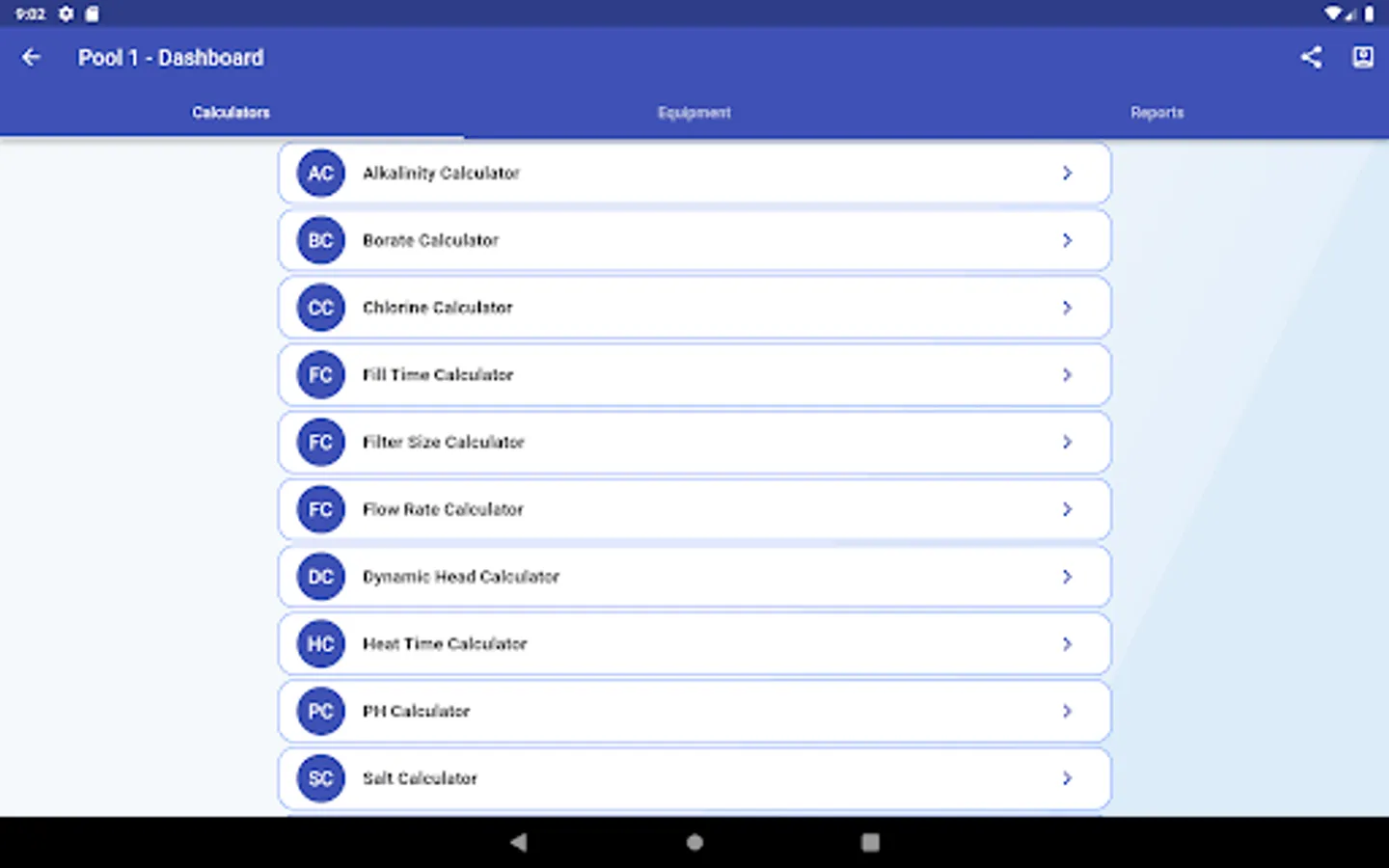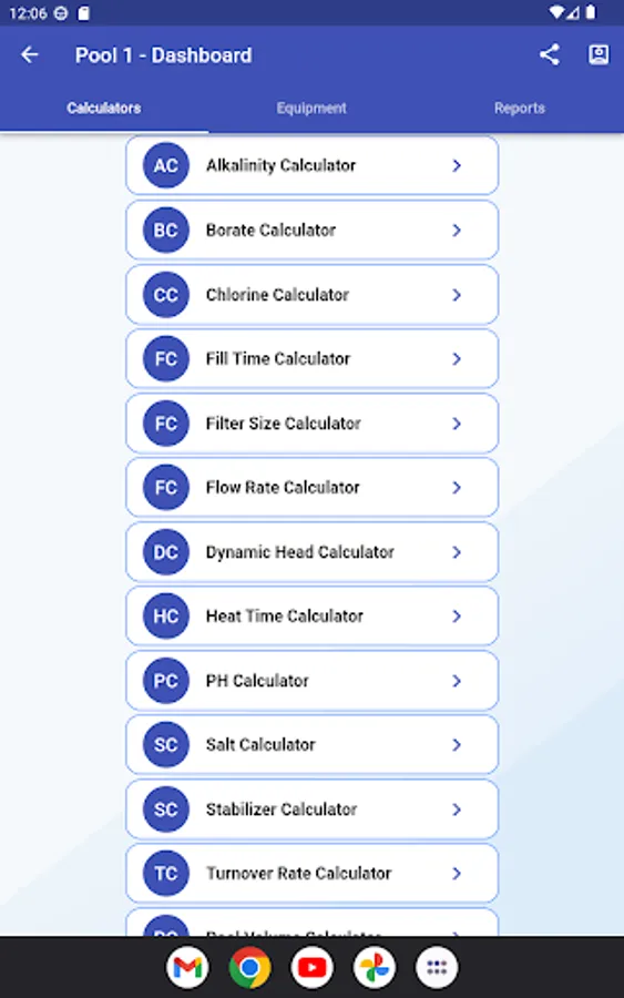 In addition to calculating chemical levels, PCC can also calculate filter size, fill time, heat time and a few other handy parameters about your pool.