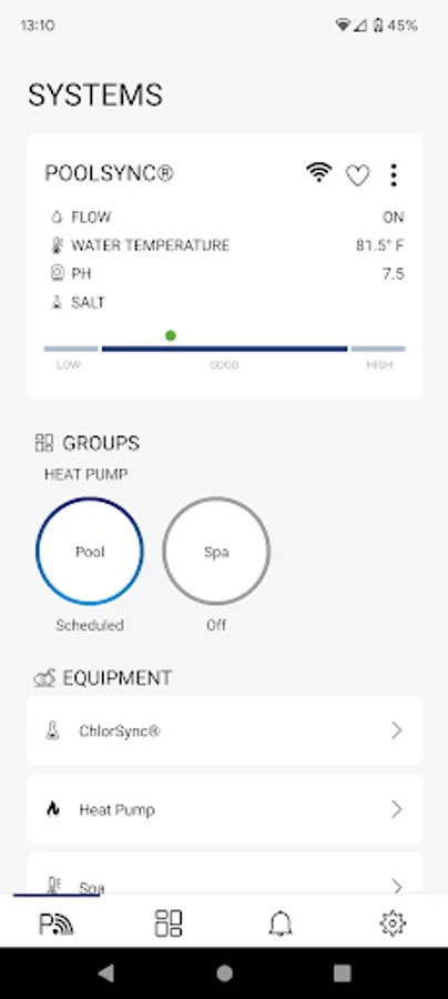 Effortlessly control PoolSync Ready equipment from the your Android device. Adjust the heat pump set point, change the sanitization level, create schedules and receive alerts when action needs to be taken. Home or away always be in sync with your pool.
