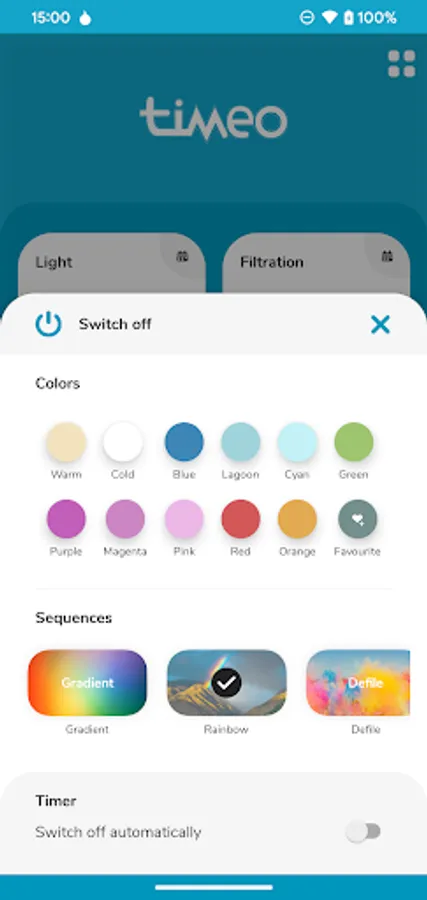 Timeo is your new technical room control application. It allows you to control, by bluetooth, the main functions of your swimming pool: filtration pump program, light control.