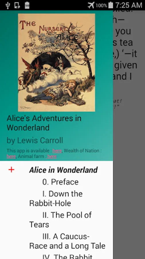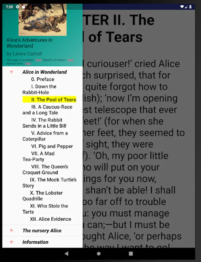 This app contains these two books 'Alice's Adventures in Wonderland' and 'Nursery Alice'