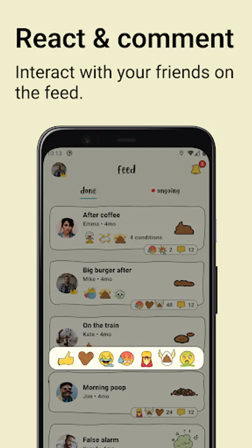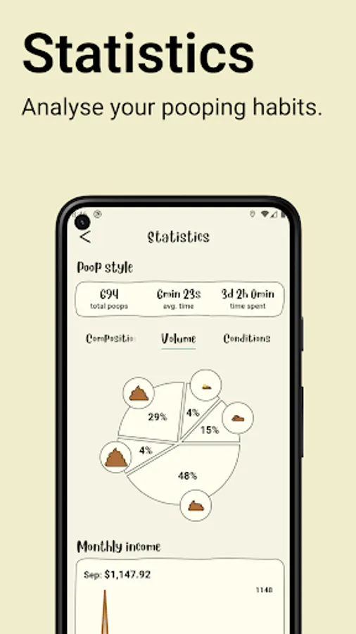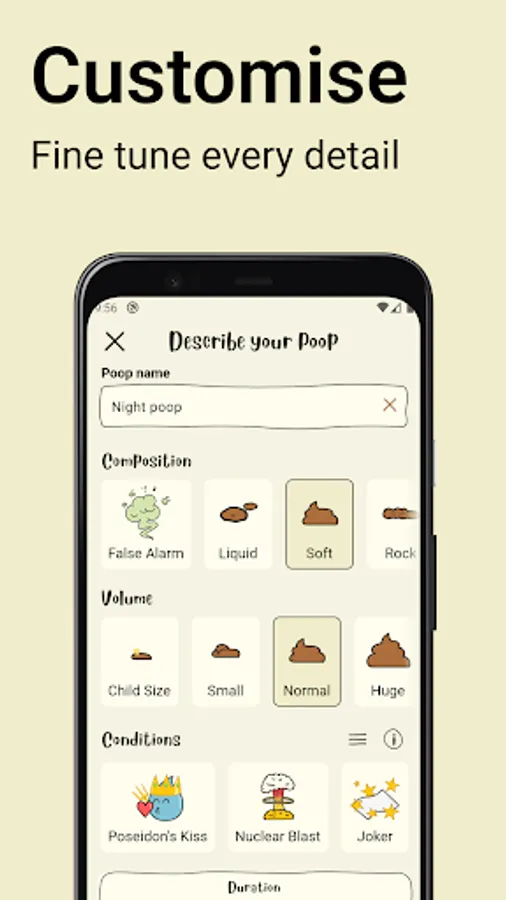 Customize your poop with cartoon-like drawings and complete your experience with funny conditions.