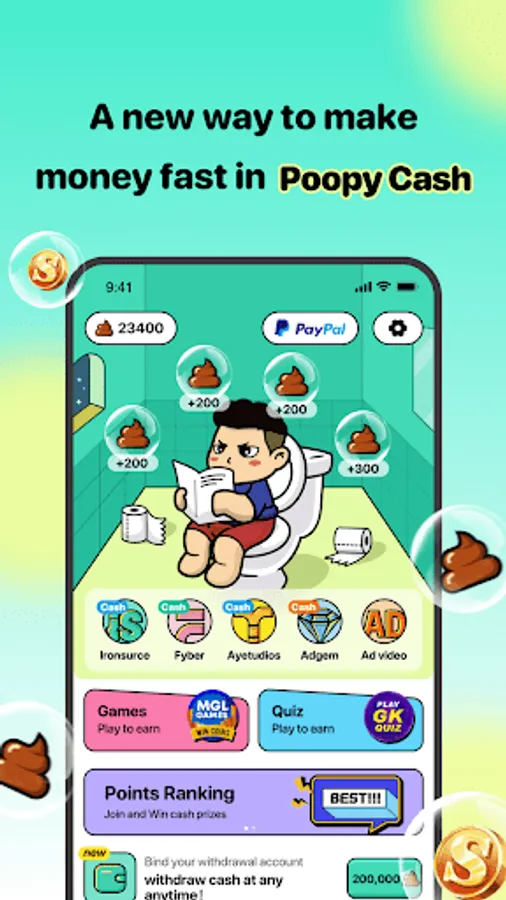 Poopy Cash is an easy to use app to earn real cash. Complete tasks every day, produce a lot of poops, and earn rewards at any time to get rewards. How cool is that!