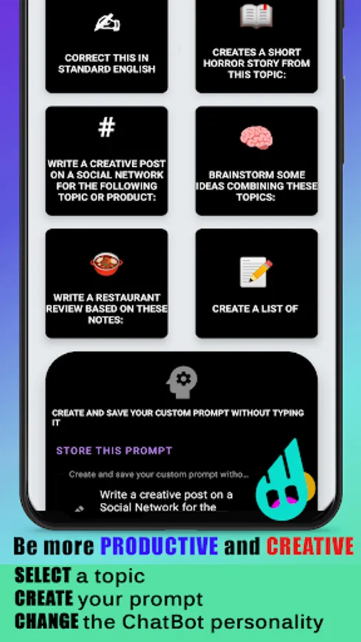 • Custom Prompts allow you to change the chatbot personality to better describe any expertise or topic you would like to explore