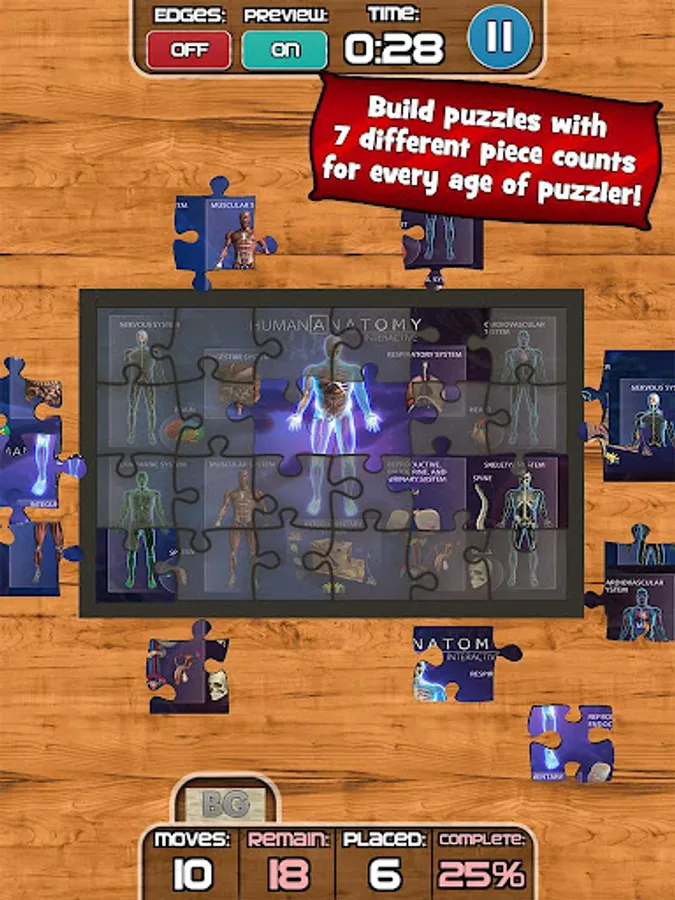 Popar has many categories ranging from dinosaurs, sea animals, safari, construction vehicles, princesses, human anatomy, sports, all the way to our solar system, and many more places and pieces in-between! Each interactive puzzle features 7 different piece counts to choose from (the easy 6 piece to the expert 300 pieces). Some additional features include border selection, unique backgrounds, a timer, and soon to feature competitive puzzling with your friends!