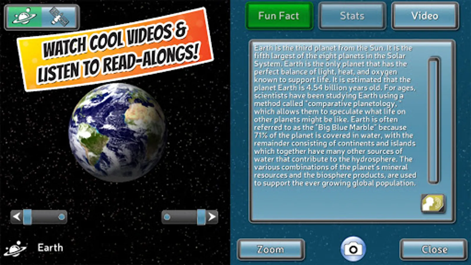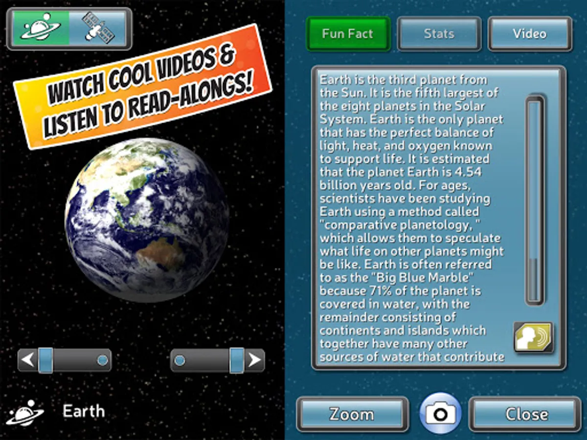 -Fun and informative read-along fun facts about all the planets and probes/satellites