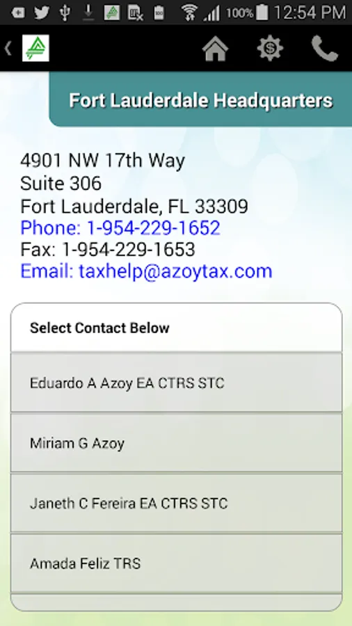 - Contact section for when you need some guidance from your accountant. Sort through branches to choose your accountant and save them as a contact. Now their contact information is always visible - from phone number, address, and directions to website, Facebook, and Twitter.
