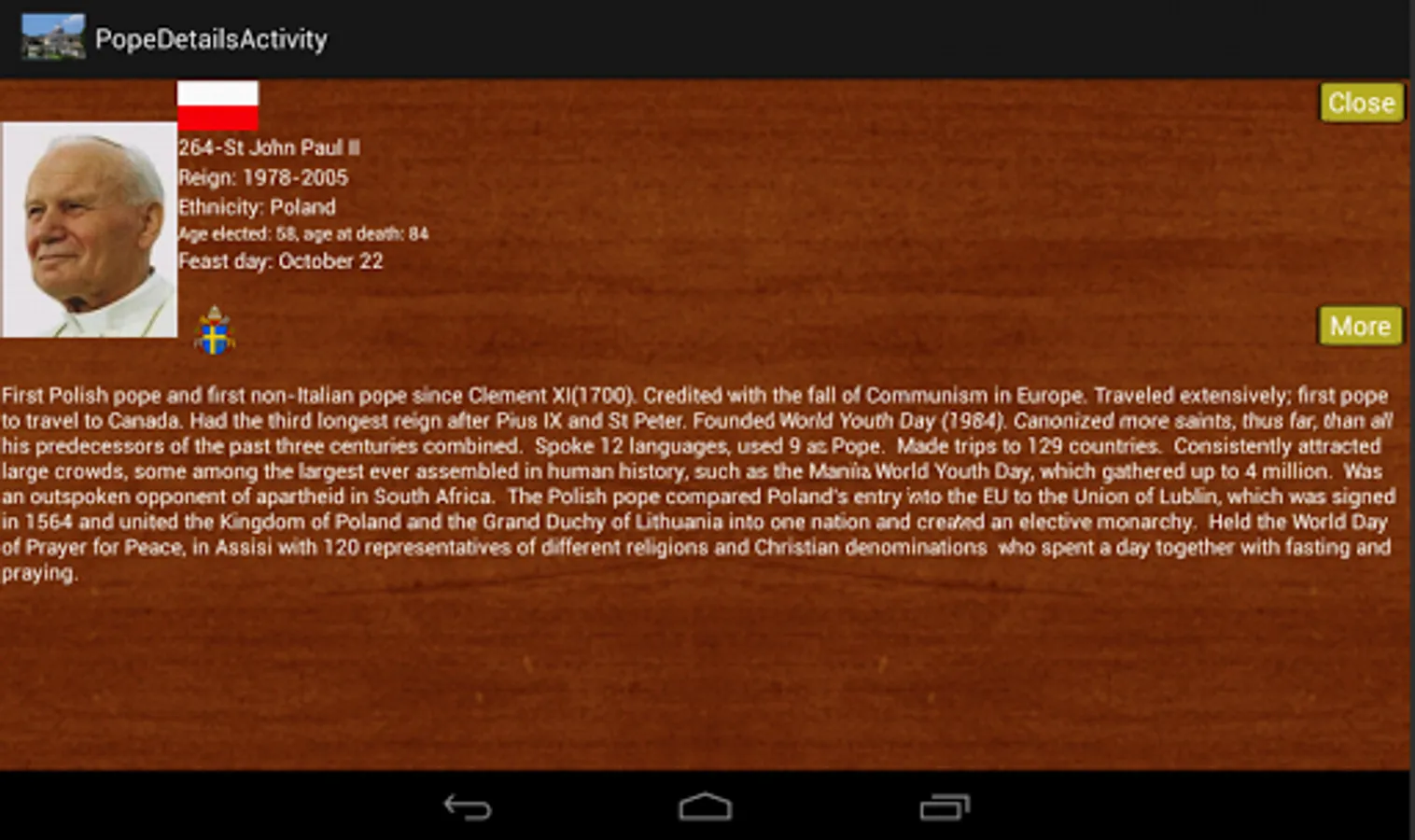 A details view is provided for every Pope, with a more button to view a more complete profile on the web.