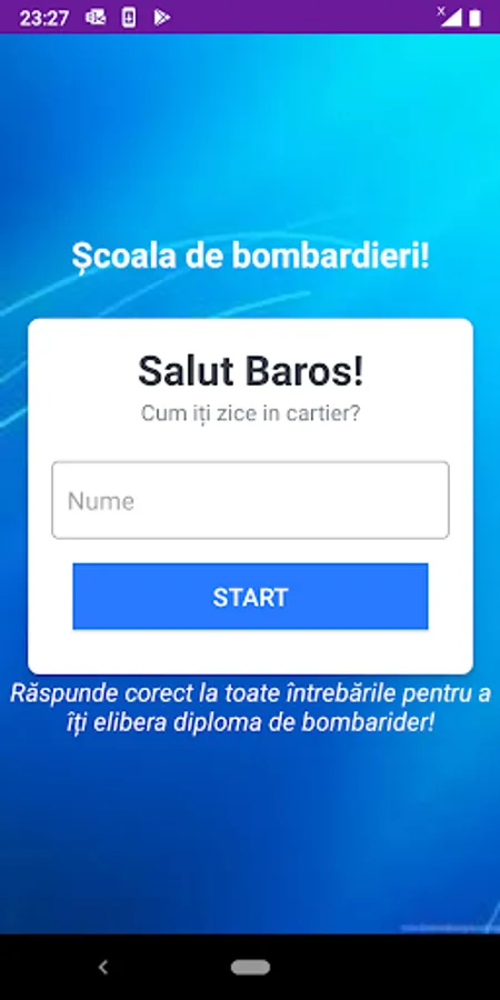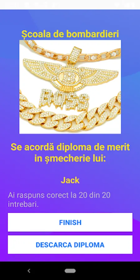 Bomber School - The application presents a set of questions. Answer all the questions correctly, in order to issue your bomber diploma.