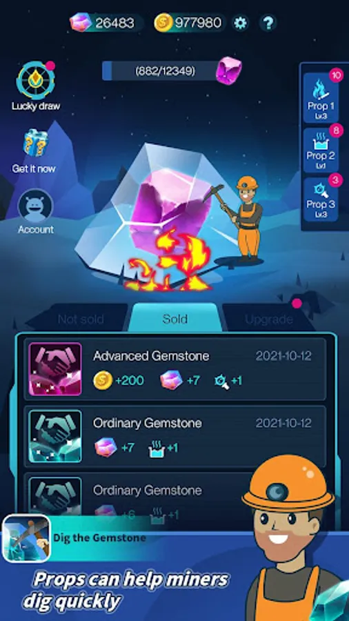 Touch the Gemstone with your finger and keep rubbing, and the friction will direct the miner to start mining. Because the rock layer is too thick and the progress of digging layer by layer is limited, we can use props, and use props to quickly dig through. And there are many places to get props, so you can get more props quickly. Regardless of manual friction or use of props, the ultimate goal is to get the Gemstone in the rock formation. Digging the rock formations will eventually get rich Gemstone rewards.