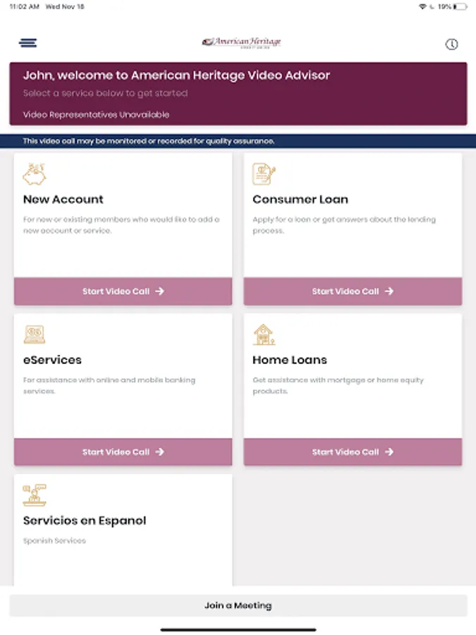 American Heritage Video Advisor lets you securely interact with professionals you trust from anywhere. The app allows you to video chat and conduct business all in one simple tool.