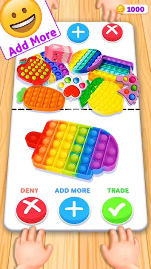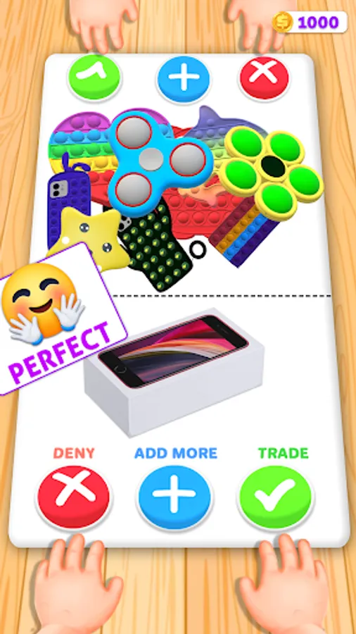 Swap up to add more and more fidget toys 3D. Throw the fidget toys onto the table and wait for your opponent move only accept offers when you think you will get more toys from your opponent once you accept the offer finish the legal fidget trade if you think you are going to loss reject the opponent's offer after completing the deal you will get coins and the quantity of the coins depends on the deal if you get more toys from your opponent then you get more coins you can easily change your trading room environment and unlock new fidget toys by using these coins.