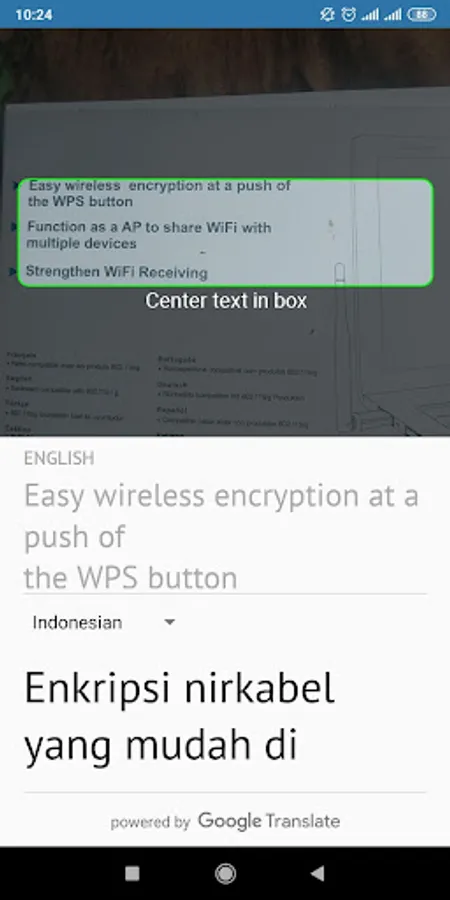 This app recognize text from real-time camera feed to identify language and will translate text to any chosen language out of 59 options.