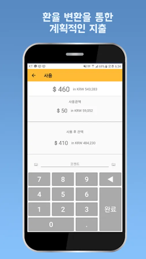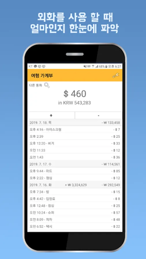 여행이나 출장 중 사용하는 비용을 설정 된 기준 국가 통화 단위로 변환, 정리해줌으로써 계획적인 소비를 할 수 있도록 도와줍니다.