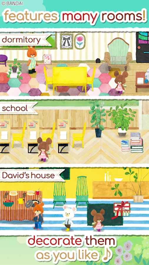 As well as decorating your Garden with cute objects, plants and buildings, you can also redocorate characters rooms and other locations in Mount Moonlight. Enjoy cute animations as characters interact with their surroundings.