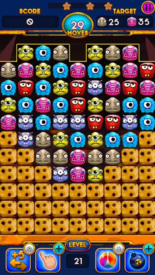 Match any 3 aliens to eliminate rows and complete objectives to progress to the next level. Match 4 or more to create super aliens with magnificent effects. Can you earn all 3 stars in every level?