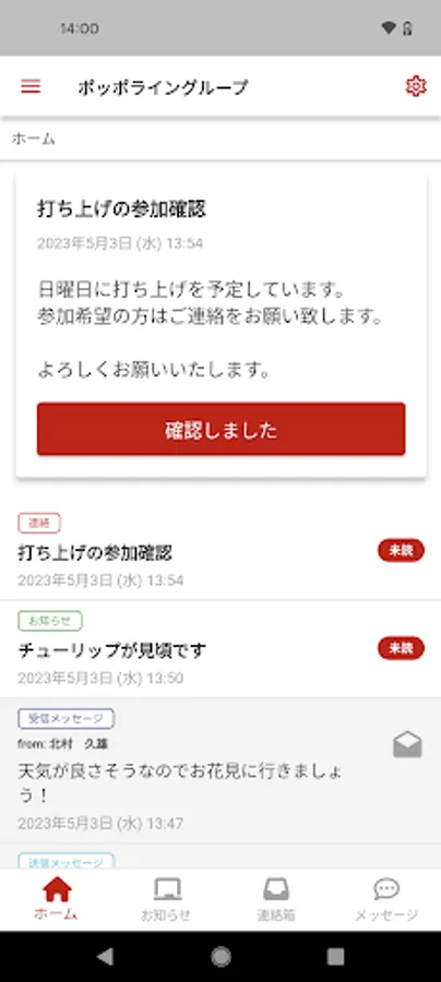 You can immediately check the notifications sent from Poppoline at any time, such as bulletin boards, mass transmissions, and individual messages.