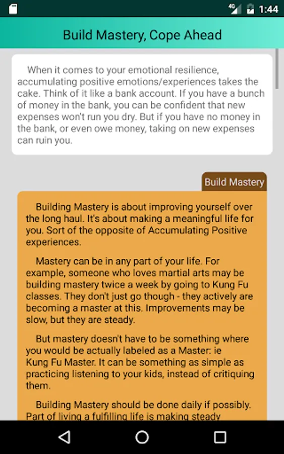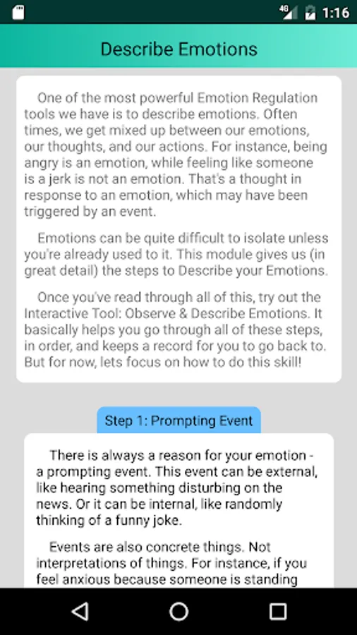 Like all our 'Tools' apps, we'll start you off with a description of what DBT is. While DBT is a set of skills, there is also a sort of culture around it. And a way of teaching/learning it. Getting an overview of what DBT is, you can more easily see where the skills fit in, and where you can most effectively integrate them into your day-to-day.