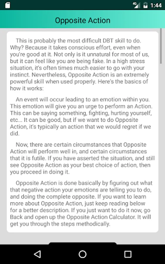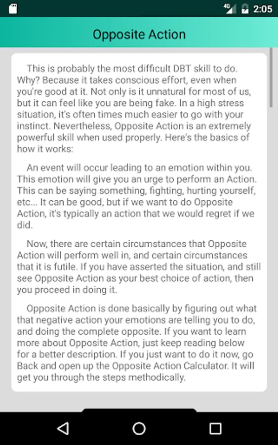 • Opposite Action Calculator: If you've ever tried Opposite Action, you know it's not intuitive. Use this tool to prep for stressful situations or do Opposite Action on the spot.