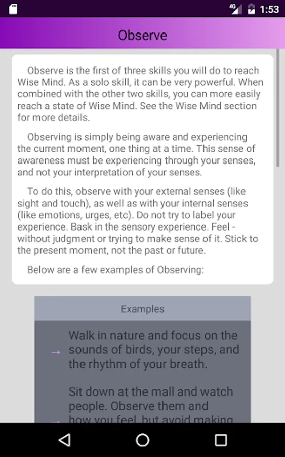 Like all our 'Tools' apps, we'll start you off with a description of what DBT is. While DBT is a set of skills, there is also a sort of culture around it. And a way of teaching/learning it. Getting an overview of what DBT is, you can more easily see where the skills fit in, and where you can most effectively integrate them into your day-to-day.