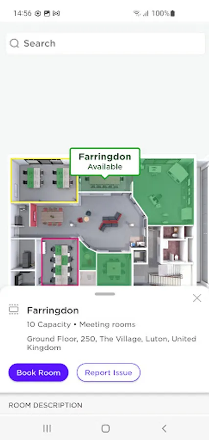 • Report issues - Something not in working order at your desk or in a meeting room? Report it through the app to alert the facilities team of maintenance needed