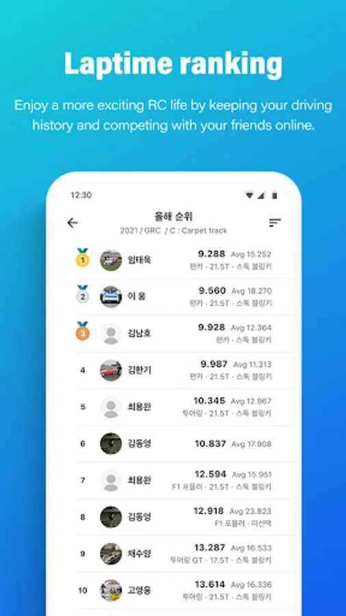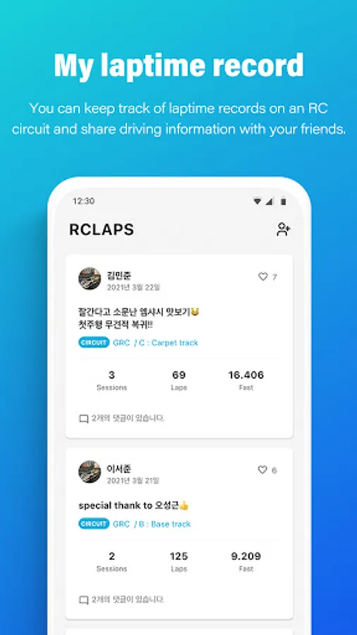 You can keep track of laptime records on an RC circuit and share driving information with your friends.
