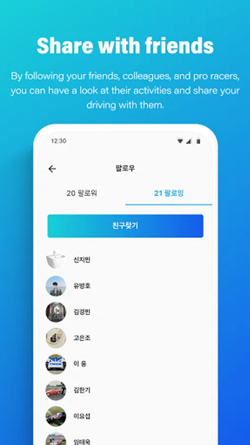By following your friends, colleagues, and pro racers, you can have a look at their activities and share your driving with them.