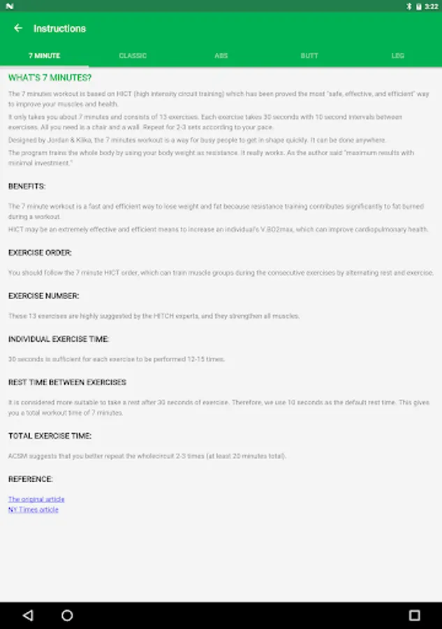 The best workout app consists of only 12 exercises to be done for 30 seconds, with 10 second breaks between each exercise. All you need is a chair and a wall. Repeat 2-3 circuits depending on how much time you have. Make it your first choice at home or at the office.